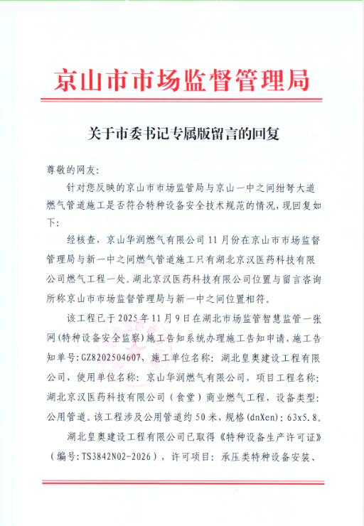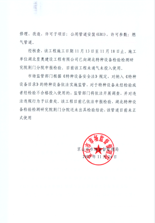 依据《压力管道监督检验规则》(TSG D7006—2020),该规则适用于《特种设备目录》规定范围内压力管道(长输管道、公用管道和工业管道)的安装过程,以及改造或者重大修理(应急抢修的管道施工过程除外),一次性更换相同介质的管道总长度大于100米的过程。燃气管道属于公用管道,均需接受监督检验。规则明确规定,应当进行监检而未经监检或者监检不合格的压力管道,不得投入使用。《中华人民共和国特种设备安全法》第二十三条规定,特种设备安装、改造、修理的施工单位应当在施工前将拟进行的特种设备安装、改造、修理情况书面告知直辖市或者设区的市级人民政府负责特种设备安全监督管理的部门,第七十八条规定:违反本法规定,特种设备安装、改造、修理的施工单位在施工前未书面告知负责特种设备安全监督管理的部门即行施工的,或者在验收后三十日内未将相关技术资料和文件移交特种设备使用单位的,责令限期改正;逾期未改正的,处一万元以上十万元以下罚款。请问贵局对贵单位门口道路(绀弩大道)的特种设备(压力管道施工)是否履行监管职责?施工单位是否进行了安装告知与安装监督检验? |